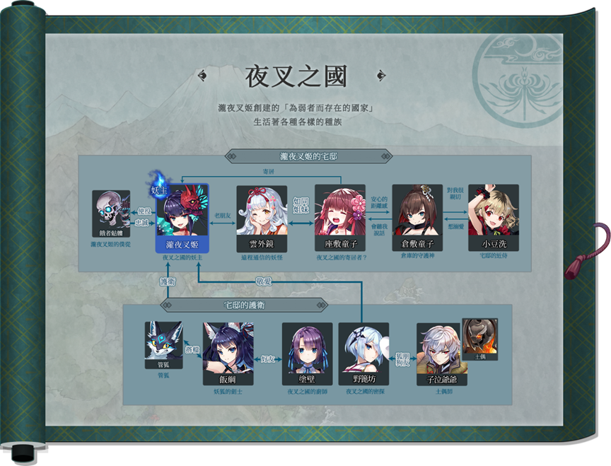 龐大的「幻妖界」主要由八大之國構成,分別是「夜叉之國」、「山獄之國」、「花魁之國」、「堺之國」、「鬼之國」、「天狗之國」、「大蛇之國」、「妖狐之國」,做為救世主的你,獨自一人被召喚到幻妖界中,為弱者而存在的國家「夜叉之國」為起點,在幻妖界各方勢力的周旋對立下,踏上對抗黑化安倍晴明的壯闊旅程。