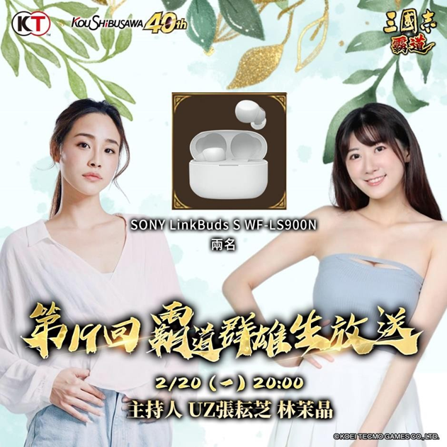 本次節目也為玩家準備實體好禮,在線上觀看節目的玩家們,只要追蹤『三國志霸道』FB 粉絲專頁、分享《霸道群雄生放送》第 19 回直播貼文以及@一位好友與留言;或是訂閱臺灣光榮特庫摩 YouTube 頻道並留言,即有機會獲得 SONY WF- LS900N 無線耳機(價值 NT$4,990)豪華大獎!請玩家們務必呼朋引伴共襄盛舉, 鎖定『三國志 霸道』官方 Facebook 粉絲專頁或臺灣光榮特庫摩 YouTube 頻道共同參與直播活動。