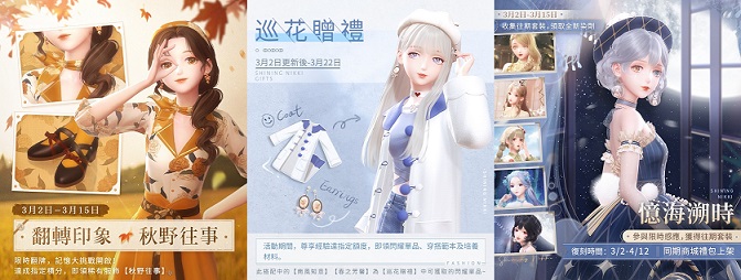 此次遊戲更新後至3月15日,「秋野往事」活動開啟,玩家完成挑戰累計積分,即可獲得稀有服飾「秋野往事」;3月2日至3月22日,「巡花贈禮」限時活動開啟,玩家尊享經驗到達指定額度即可獲得閃耀單品、穿搭模板、動作、貼紙背景及大量培養材料;此次遊戲更新後至4月12日,「憶海溯時」限時復刻活動開啟!心之門限時開放復刻套裝感應活動,指定套裝收集一定部件可獲得全新染劑獎勵!