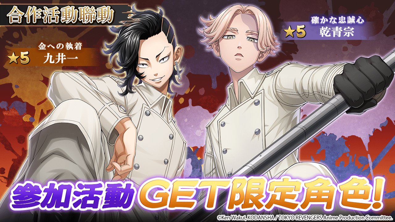 電視動畫《東京復仇者:聖夜決戰篇》中的「花垣武道」、「佐野萬次郎」、「龍宮寺堅」、「乾青宗」、「九井一」以及「柴大壽」等角色將作為合作角色於遊戲中登場。
