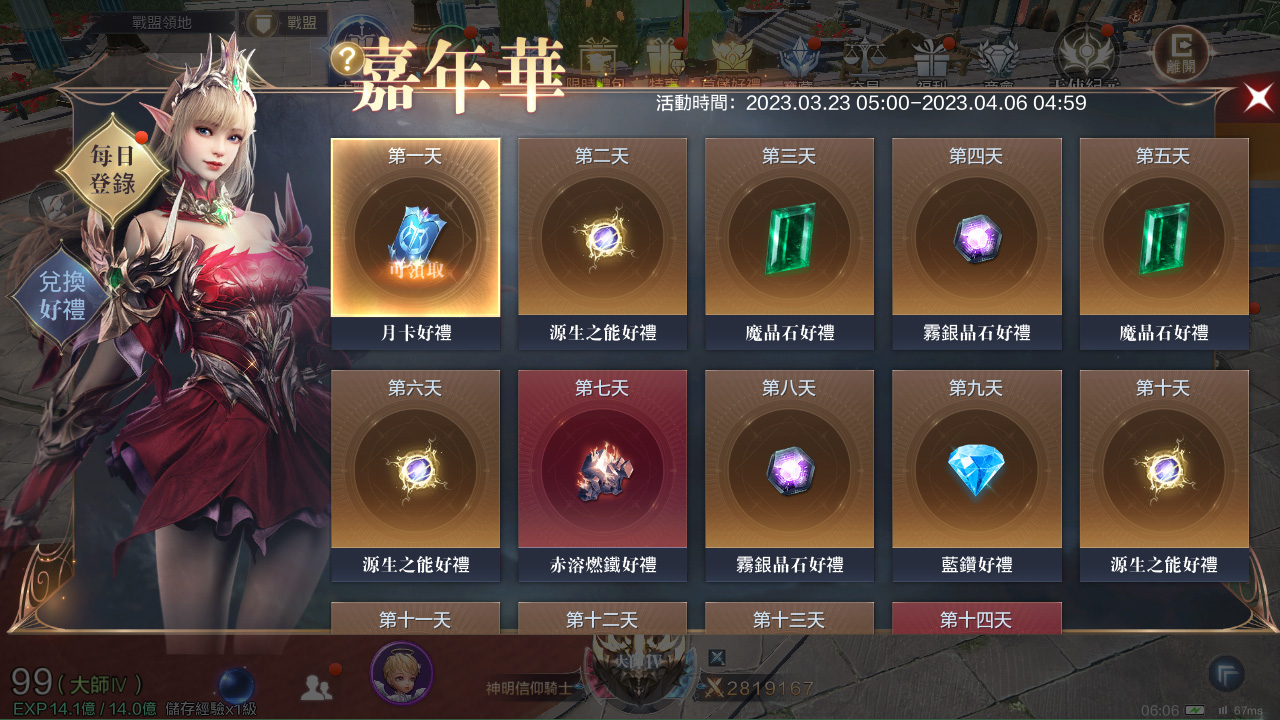 即日起至 4 月 6 日,玩家每日登入即可在簽到活動免費領取小月卡、魔晶石、霧銀晶石、源生之能、藍鑽、赤溶燃鐵、鑄紅水晶...等豐富多樣的遊戲好禮!