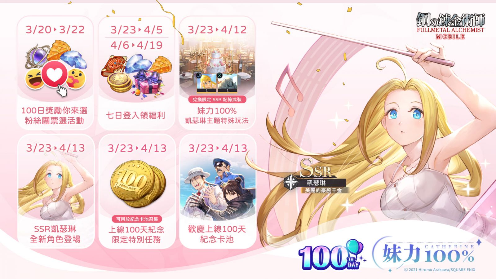 《 鋼之鍊金術師 M 》全新主題活動「妹力 100%」閃亮登場!參與系列活動即可兌換限定頭像框、限定 SSR 記憶武裝等豐富道具獎勵,還有全新 SSR 角色「凱瑟琳」美麗亮相。同時為了慶祝《 鋼之鍊金術師 M 》在台上線 100 天,遊戲特別推出 100 天限定紀念活動,參與活動贏取豐富大獎,機不可失,一起來歡度這個美好的紀念日吧!