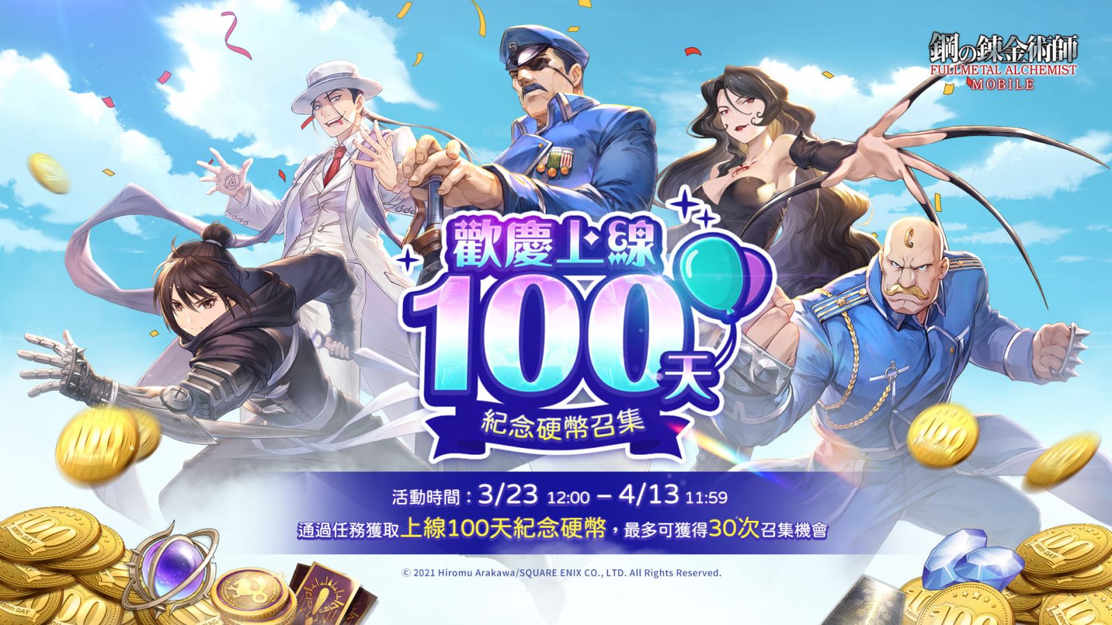 為了慶祝《鋼之鍊金術師 M》上線 100 天,遊戲特別推出「歡慶上線 100 天 Step Up 召集」及「歡慶上線 100 天 紀念硬幣召集」回饋玩家。活動期間完成全新 7 日登入活動以及上線 100 天特別任務,即可領取活動紀念硬幣,並有機會抽取心儀已久的超人氣 SSR 角色,還有更多豐富的道具獎勵等你來拿!