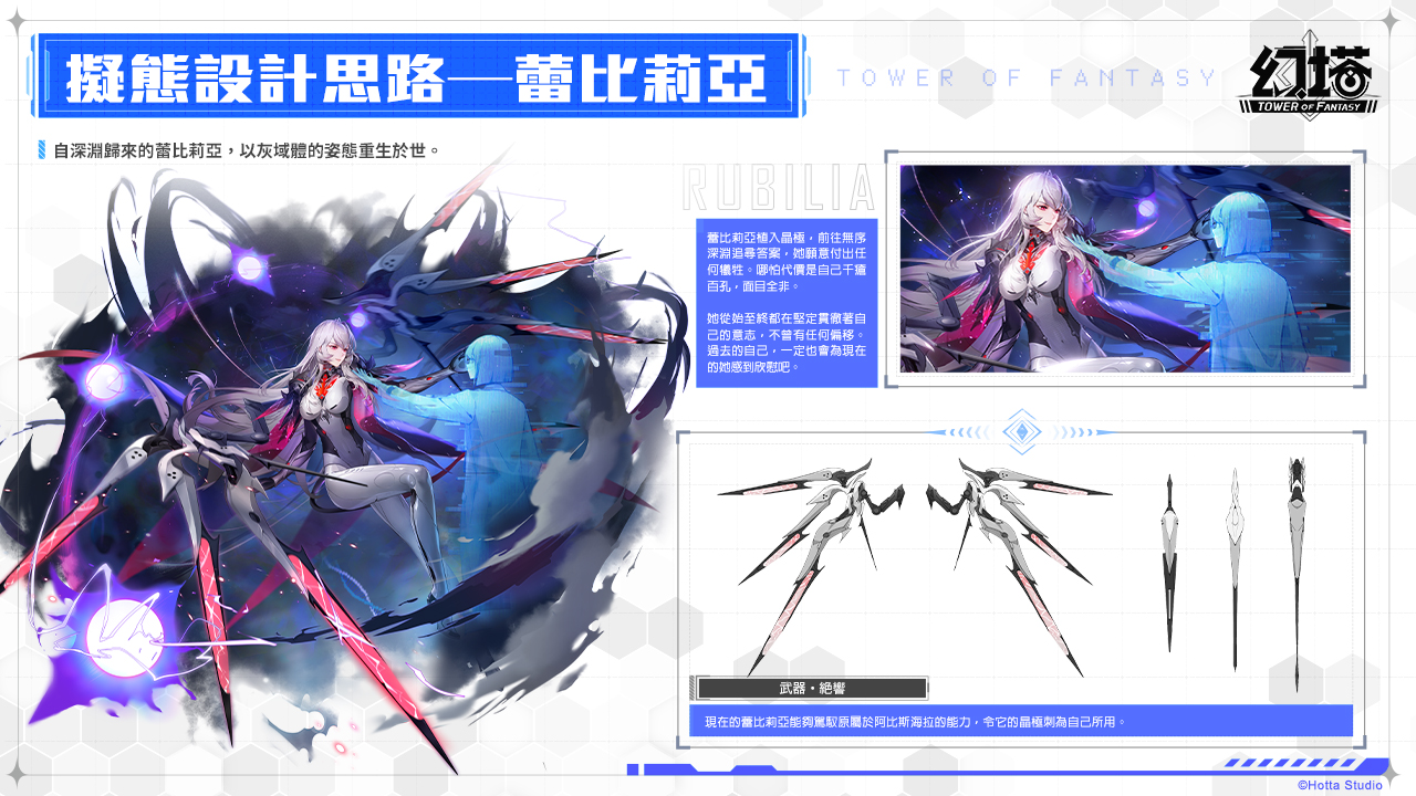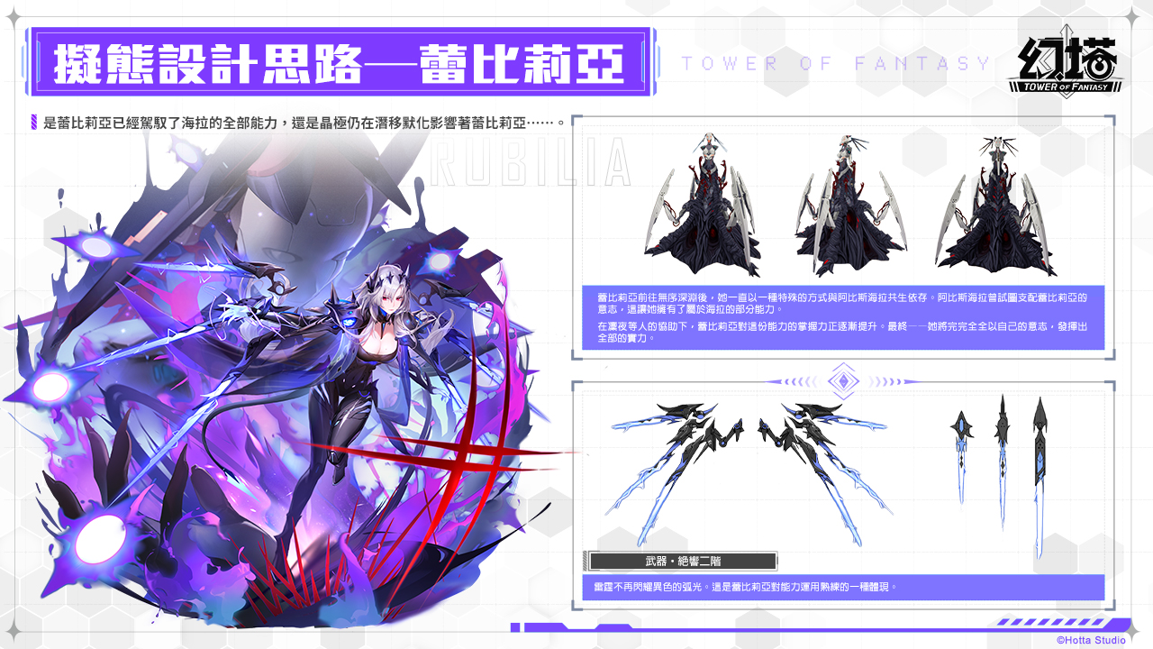 圖說:製作團隊在構思蕾比莉亞的角色設定時,結合灰域體的元素,無論是造型外觀或武器都有許多巧思。各個階級的蕾比莉亞都有不同的特色,更多細節待拓荒者到《幻塔》大世界中自行探究!