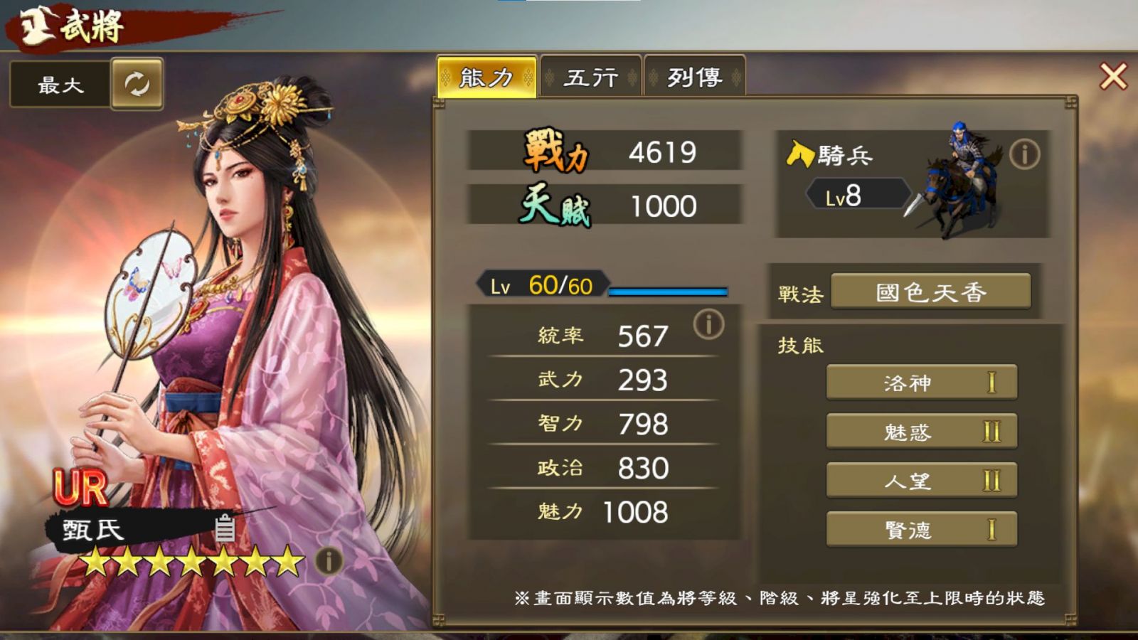 - 透過甄氏的技能「洛神」提升部隊的防禦與智力,從而提升駐軍時戰法的發 動速度。