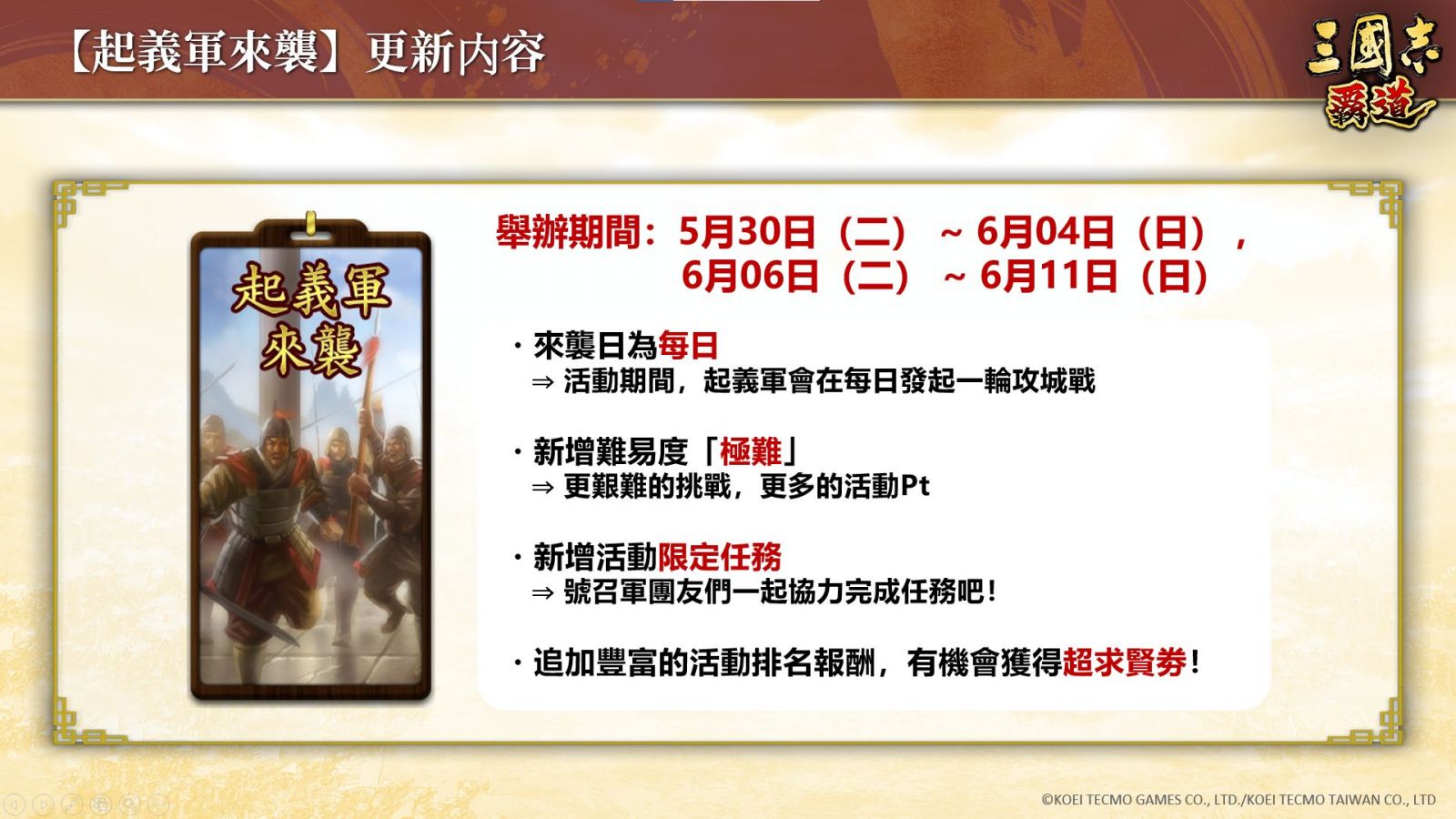 與此同時,本次更新也推出「起義軍來襲」活動,起義軍將於每日對玩家發起一 輪攻城戰,玩家們需針對不同難易度的攻城戰解決危機。這次更新除了新增了活 動限定個人任務,更强化了活動排名的報酬。以活動排名榜首爲目標,入手超求 賢券等豐富報酬吧!
