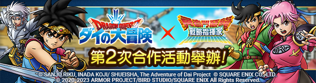 由 SQUARE ENIX 直營,「勇者鬥惡龍」系列手機遊戲『勇者鬥惡龍 戰略指揮家』國際版將展開『勇者鬥惡龍 達伊的大冒險』第2次合作活動,玩家將再次探索『勇者鬥惡龍 達伊的大冒險』世界,並與「龍騎士達伊」、「魔法師波普」與「武術家瑪姆」一行人重逢,繼續體驗精彩刺激的原創故事!