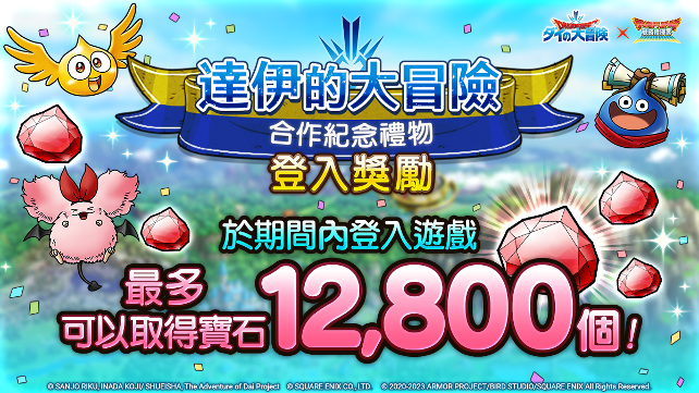 即日起將實施最多可拿到「寶石12,800個」的『勇者鬥惡龍 達伊的大冒險』合作紀念期間限定登入獎勵!期間內,首日可拿到「寶石3,000個」,之後將依照於期間內登入的天數,每天獲取「寶石200個」或「寶石1,000個」!所以不間斷地登入,收集完所有寶石吧。