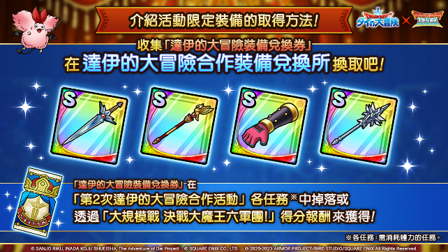 活動期間不僅能看到達伊和波普們活躍於原創劇情的活動任務中,更可讓英雄系S級角色「鎧之魔槍修凱爾」成為夥伴唷!同時在過程中還能獲得『勇者鬥惡龍 達伊的大冒險』S級角色的階級提升材料「龍之紋章寶珠」!
