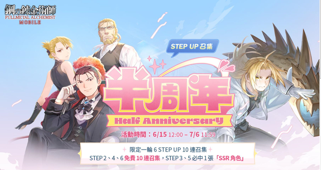 除此之外,遊戲內還特別推出「歡慶半周年 紀念硬幣召集」及「歡慶半周年 STEP UP 召集」。參與半周年福袋活動,透過體力消耗即可獲得「半」、「周」、「年」、「快」、「樂」集字碎片,集滿五字可兌換福袋開啟豐富獎勵,有機會抽中半周年限定紀念硬幣,並在「歡慶半周年 紀念硬幣召集」中免費抽取包含「SSR 愛德華(不屈的全開鍊成)」、「SSR 馬斯坦古(盜亦有道的幻焰)」、「SSR 恩維(祭夜的伯爵)」等限定 SSR 在內的人氣角色。
