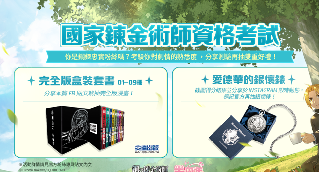 為了歡慶《鋼之鍊金術師 M》上線半周年,除了與尖端出版合作,遊戲也同步推出豐富的社群活動。玩家只要前往《鋼之鍊金術師 M》官方粉絲團,參與半周年紀念活動「國家鍊金術師資格考試」,分享貼文即有機會抽鋼之鍊金術師完全版盒裝套書夜空黑款(01-09 冊),截圖分享測驗分數再抽愛德華的銀懷錶!