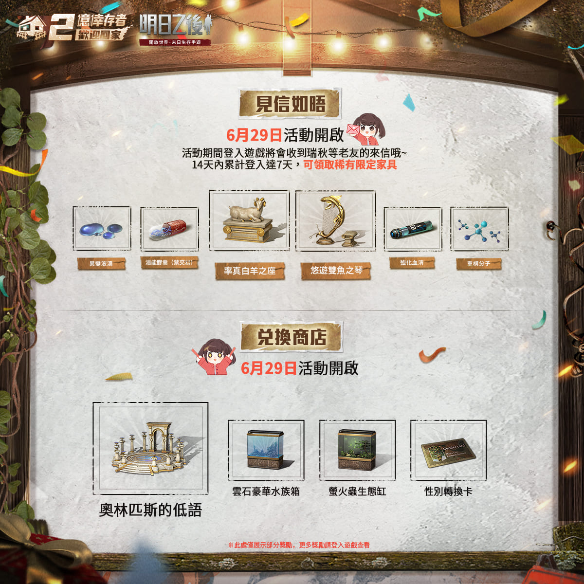 末日生存路上,有一群堅定支持倖存者的堅強後盾!狂歡慶典月期間,倖存者將會收到來自瑞秋等遊戲中好友寄來的信件,信件中將夾帶潛能膠囊、配方殘頁、強化血清等多項助於末日探險的驚喜好禮。累積登入7天,還能獲得兩款限定家具!「兌換商店」中更有多款限定家具,供倖存者免費兌換,佈置莊園。