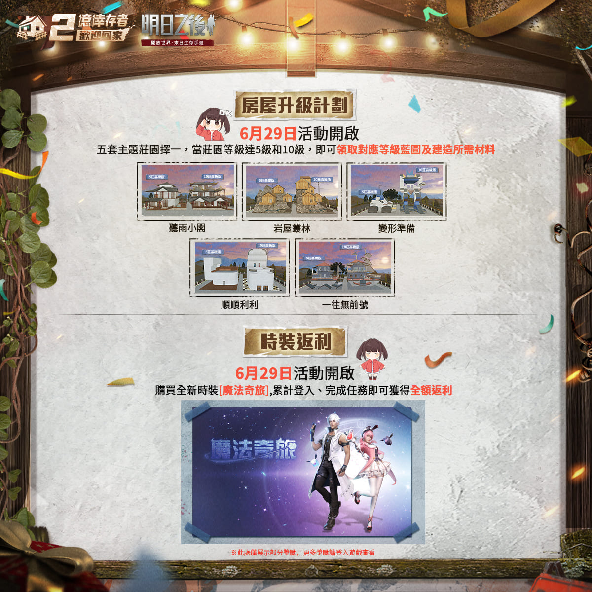 「房屋升級計劃」即刻啟動,岩屋叢林、變形準備、順順利利、聽雨小閣、一往無前號等五種主題莊園供倖存者挑選,莊園等級達5級和10級,即可領取藍圖和材料,入住心目中的精美主題莊園!另外,狂歡慶典月期間,凡購買全新時裝-魔法奇旅,累積登入並完成任務,即可獲得全額返利!還有眾多福利活動等候倖存者親自登入遊戲一探究竟,千萬別錯過。