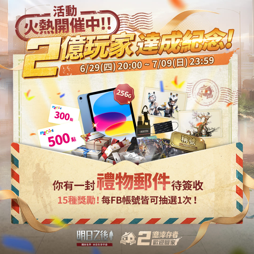 遊戲內展開多項福利活動的同時,《明日之後》官方FB粉絲專頁也開啟了「你有一封禮物郵件代簽收」福利活動!7月9日23:59前,私訊《明日之後》官方FB,並說出指定口號『2億倖存者集結我回來了』,即可簽收禮物郵件,並抽取一份獎勵!iPad、MyCard點卡、明日之後周邊、永久時裝家具等15種豪華獎勵,等候倖存者前往領取。