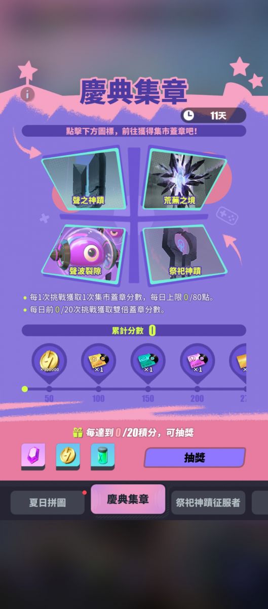 活動期間,挑戰祭祀神蹟、聲之神蹟、荒蕪之境及聲波裂隙後將可獲得市集蓋章,累計獲得一定章數,即可抽獎一次.眾多虛寶獎勵玩家們千萬不要錯過!