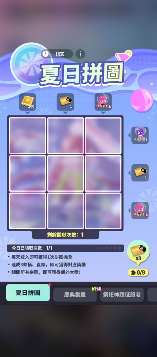 活動期間,每日登入即可獲得1次拼圖機會,透過收集拼圖並將直、橫線上的3枚拼圖拼起後,即可免費獲得黃金唱片等豐富獎勵。更多夏日福利活動都在《眾神派對》等著玩家一一解鎖!