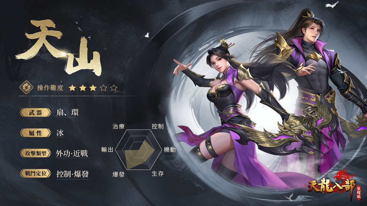 天山武學以詭異鬼魅讓人摸不著頭緒,戰鬥中往往神出鬼沒,擅長隱藏自己,在施與敵人迅若雷霆的致命一擊,令武林人士聞風喪膽!遊戲中故事開端眾人都景仰現任天山掌門虛竹子慈悲為懷,卻已然忘了靈鷲宮有著怎樣的過去?!如今,他們是三十六洞七十二島的主人並且掌控人人聞之色變的生死符。天山身後,是整個西夏王朝的傾國之力,雖然童姥已不在,但天山已然展開新的傳說...。