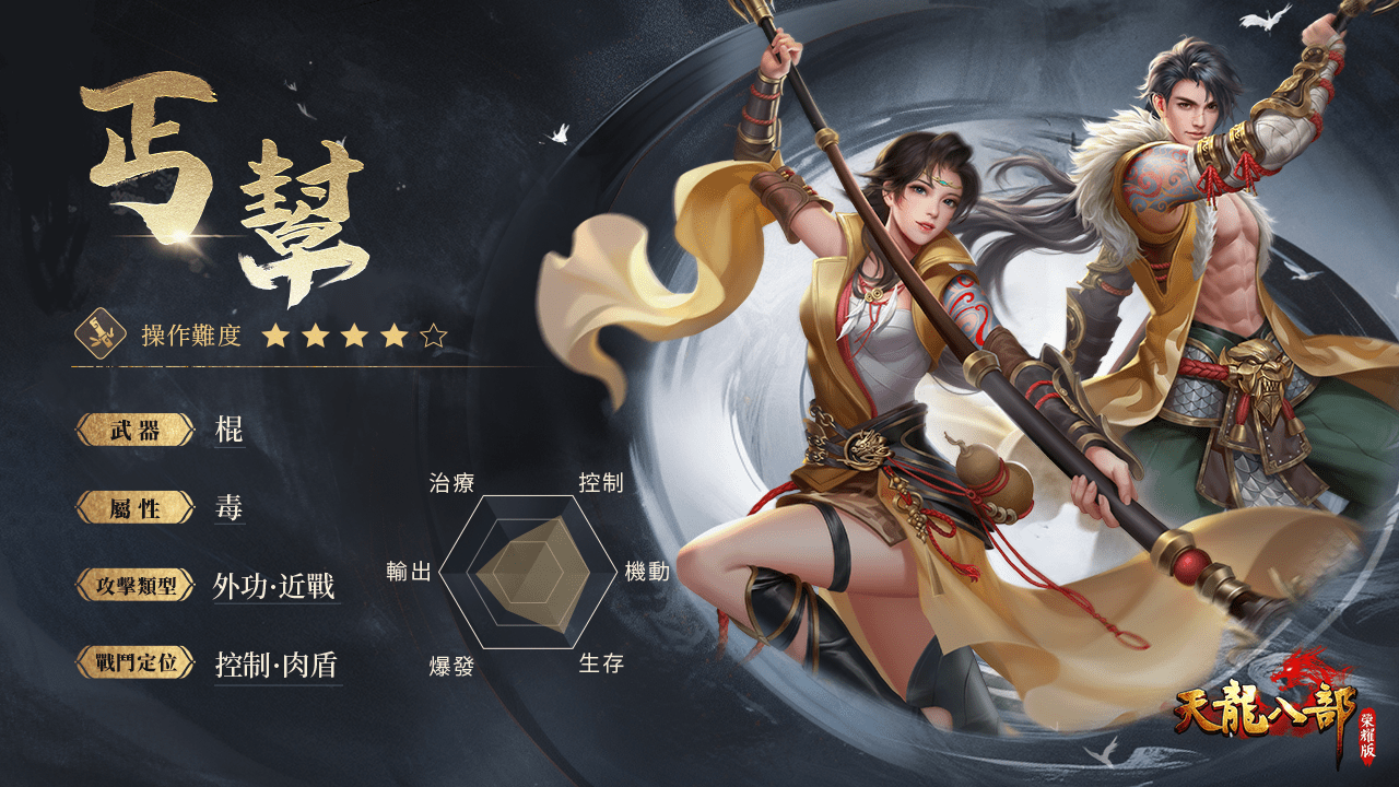 歷經數代幫主的建設,丐幫分舵遍布大江南北,乃是武林中無人不知的第一大幫,經典招式打狗棒法、降龍十八掌皆是大家耳熟能詳技能。遊戲中,丐幫弟子身法輕靈,擅長近身搏擊,進可追擊,退可固守;同時自身擁有不俗的回血與控制能力,往往能夠越戰越勇潛力無邊。