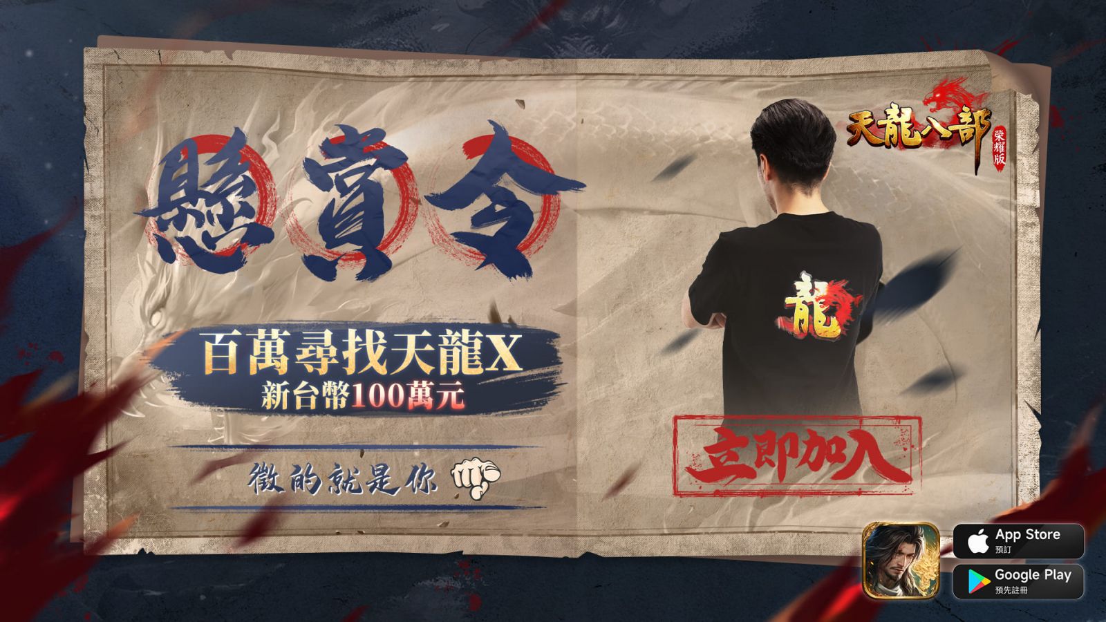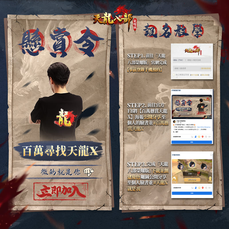 - 前往《天龍八部榮耀版》官網參加完成【事前登錄手機預約】,至遊戲FB粉絲團將【百萬懸賞天龍X】海報公開分享至個人FB,並hashtag #百萬懸賞天龍X。