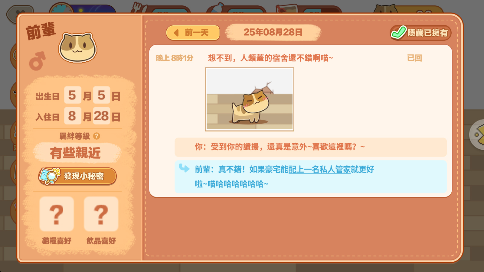 當玩家解鎖特定任務後,即可開啟「貓咪宿舍」功能!在這裡,你能自由裝潢宿舍風格,還能幫貓咪換上各種可愛服裝。在照顧方面,需要購買貓糧、飲用水,定期清理貓砂,還能陪牠們玩遊戲、聊天互動,彷彿真的在線上養一隻貓咪~